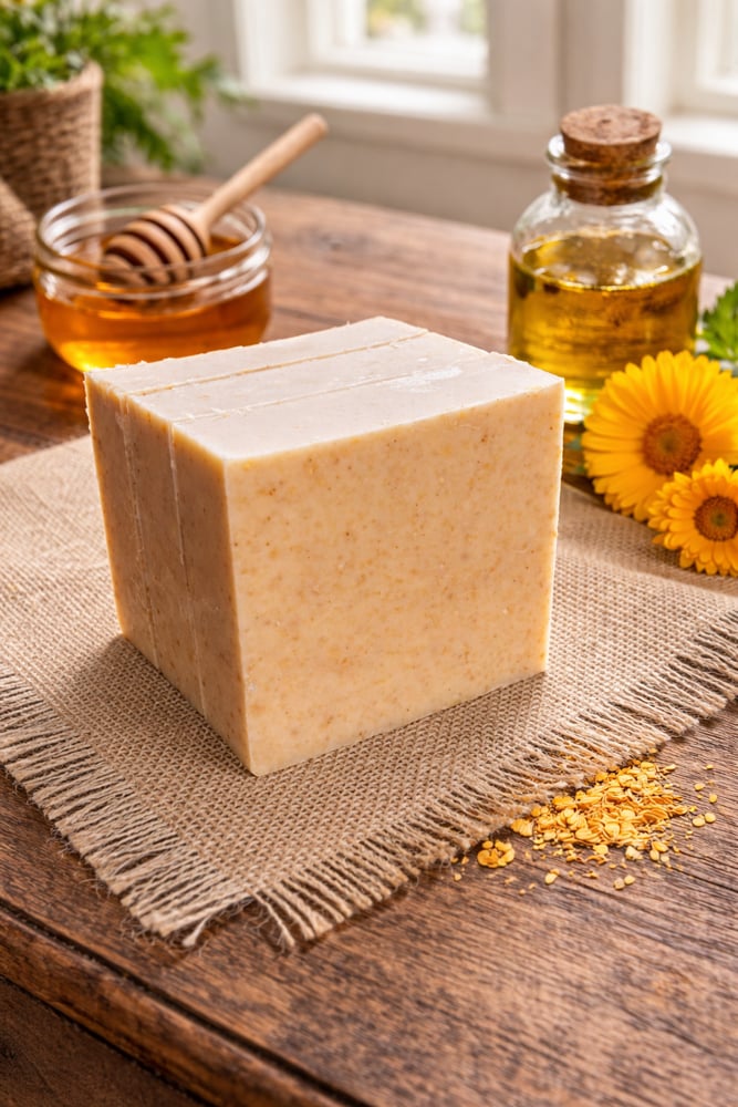 Golden Glow is a luxurious, skin-nourishing goat milk soap crafted to bring out your natural radiance. Made with fresh goat milk and locally sourced, grass-fed beef tallow, this bar delivers a rich, creamy lather that deeply moisturizes and supports healthy skin. Raw local honey and calendula-infused olive oil work together to soothe, soften, and promote a calm, balanced complexion, while a touch of turmeric helps enhance your skin’s natural glow. Tussah silk adds a silky, smooth feel, elevating every wash into a spa-like experience. Lightly scented with warm, grounding notes of frankincense and myrrh essential oils, Golden Glow is a gentle yet effective facial and body bar designed to leave your skin feeling soft, luminous, and beautifully refreshed.