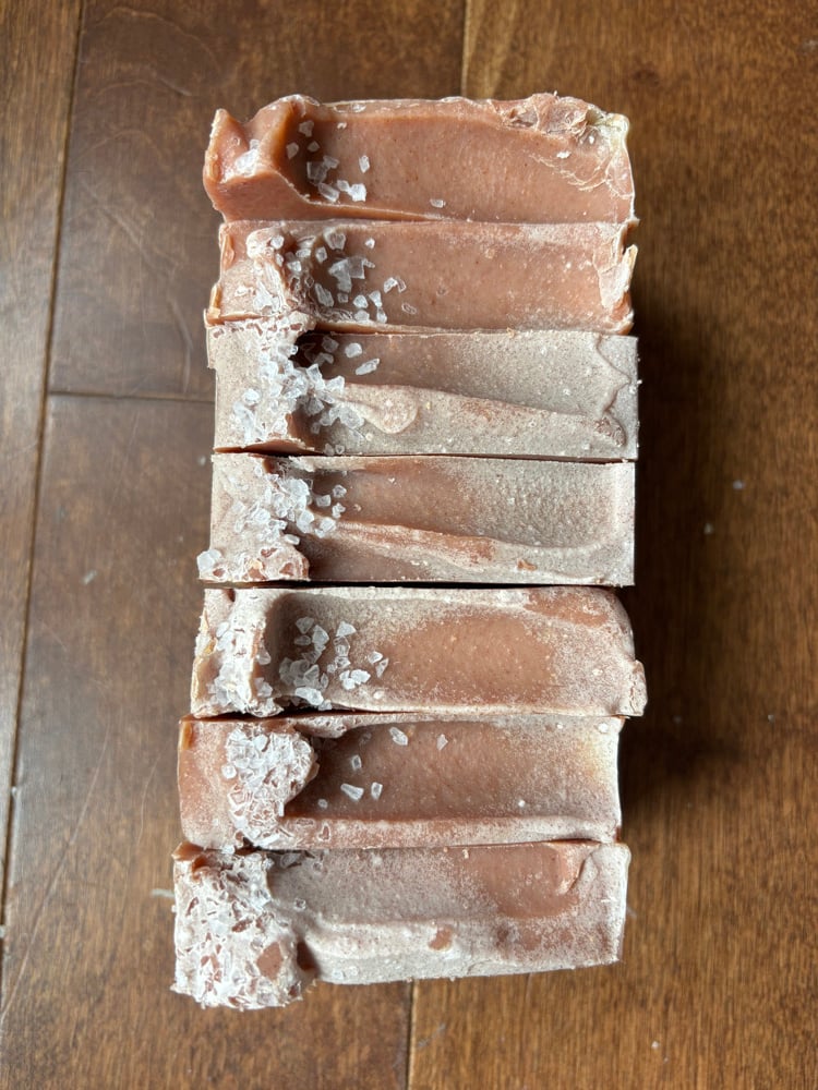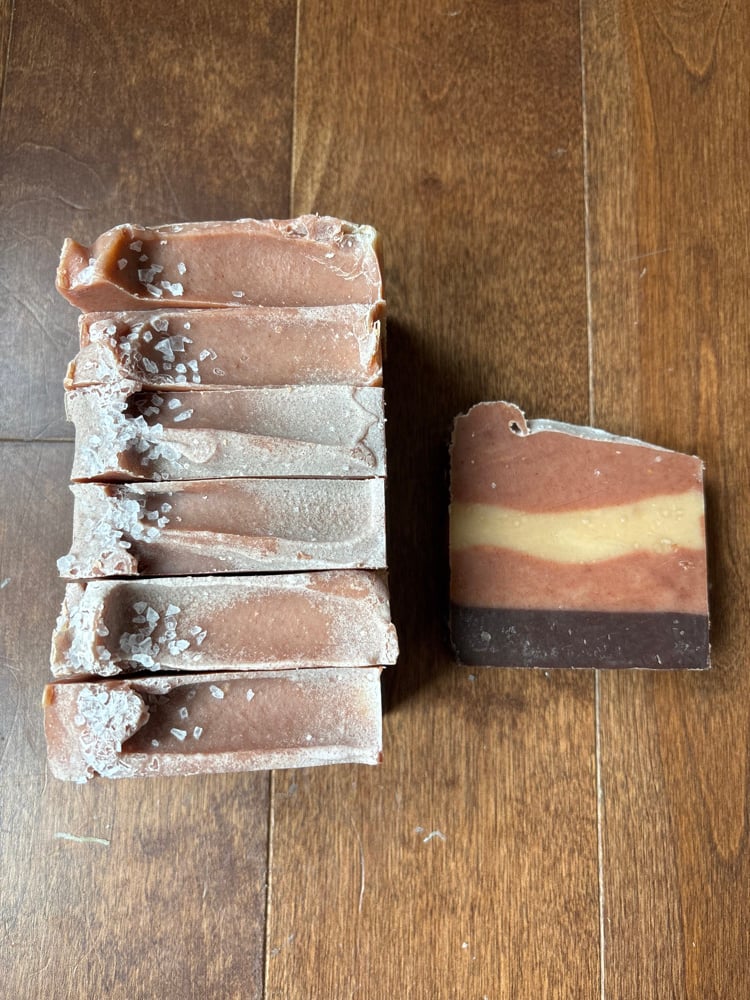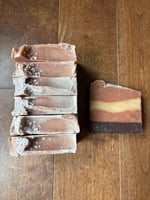 Cool peppermint essential oil is blended with warm cocoa fragrance for a delightful combination. This soap is fresh and warm and smells just like the holidays. A perfect choice to gift or use yourself throughout the holiday season! Cocoa powder colors the cocoa “brown” portion of each bar, while madder root powder creates the red! This soap looks good enough to eat!